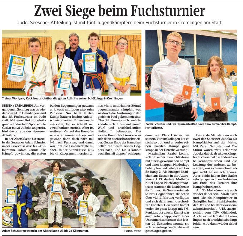 Am Sonntag den 19. April war es wieder so weit. In Cremlingen fand das traditionelle Fuchsturnier des TSV Hordorf statt. Es war die 25. Turnierausrichtung speziell für Nachwuchsjudokas der Altersgruppen U8 bis U13. Rund 200 junge Judokas aus ganz Südniedersachsen hatten sich in Cremlingen zum Wettkampf eingefunden. Mit einer Rekordbeteiligung von 23 Judokas aus allen Abteilungen war der Judo-Karate-Club Sportschule Goslar (JKCS) angereist, davon 9 aus Goslar, 6 aus Clausthal-Zellerfeld, 5 aus Seesen, 2 aus Liebenburg sowie einer Teilnehmerin aus Bad Harzburg.